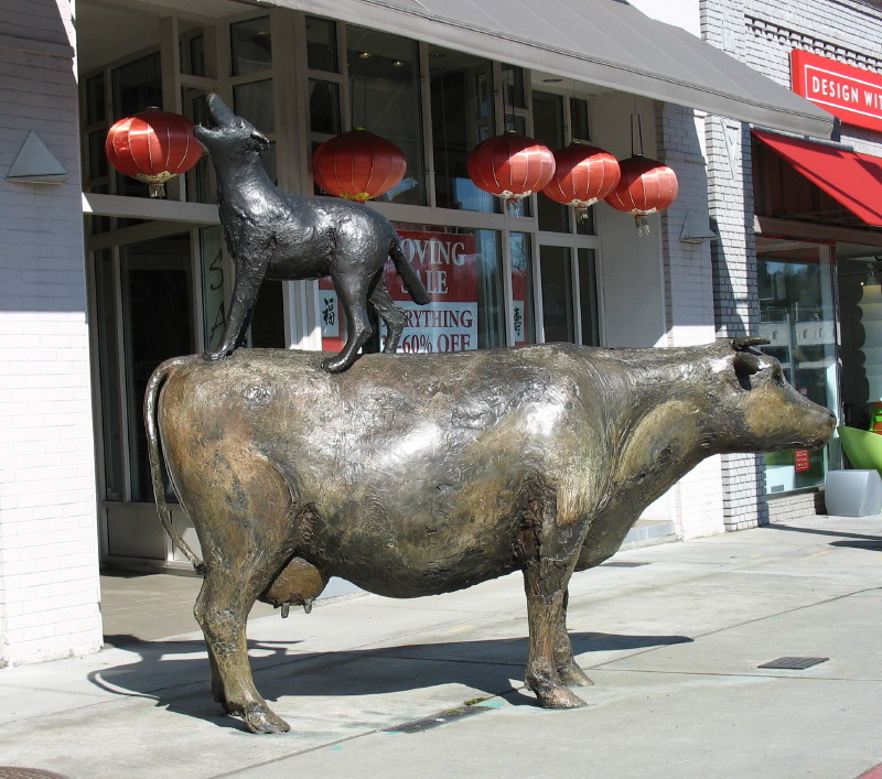 A dog standing on a cow. Perfectly normal sight in a downtown core.