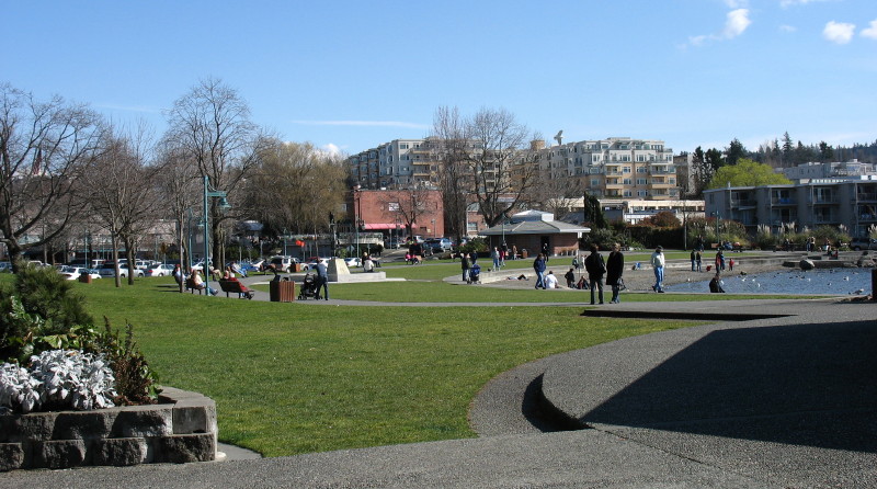 A small park on the waterfront. Even in March, there's lots of people about. Tons of dogs walking around - this town is very dog-friendly.